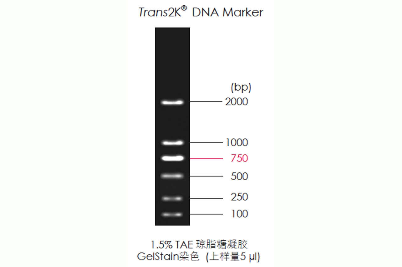 Trans2K? DNA Marker是由6條線狀雙鏈DNA條帶組成,適用于瓊脂糖凝膠電泳中DNA條帶的分析,不建議用于聚丙烯酰胺凝膠電泳。本產(chǎn)品為即用型產(chǎn)品,已含有1×Loading Buffer,可根據(jù)實驗需要,直接取5 μl電泳,使用方便, 電泳圖像清晰。其中750 bp條帶濃度為100 ng/5 μl,顯示亮帶,其余條帶濃度均為50 ng/5 μl。便于準(zhǔn)確判斷目的產(chǎn)物DNA的量。