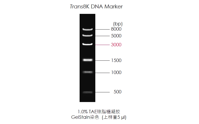 Trans8K DNA Marker由6條線狀雙鏈DNA條帶組成適用于瓊脂糖凝膠電泳中DNA條帶的分析,不建議用于聚丙烯酰胺凝膠電泳。本產(chǎn)品為即用型產(chǎn)品,已含有1×Loading Buffer,可根據(jù)實(shí)驗(yàn)需要,直接取5 μl電泳,使用方便,電泳圖像清晰。其中3000 bp條帶濃度為100 ng/5 μl,顯示亮帶,其余條帶濃度均為50 ng/5 μl。便于準(zhǔn)確判斷目的產(chǎn)物DNA的量。