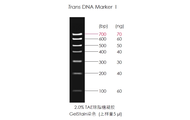 Trans DNA Maker I是由7條線狀雙鏈DNA條帶組成,適用于瓊脂糖凝膠電泳中DNA條帶的分析,不建議用于聚丙烯酰胺凝膠電泳。本產(chǎn)品為即用型產(chǎn)品,已含有1×Loading Buffer,可根據(jù)實驗需要,直接取5 μl電泳,使用方便,電泳圖像清晰。便于準(zhǔn)確判斷目的產(chǎn)物DNA的量。