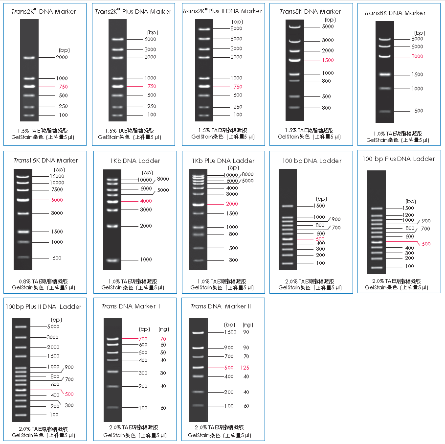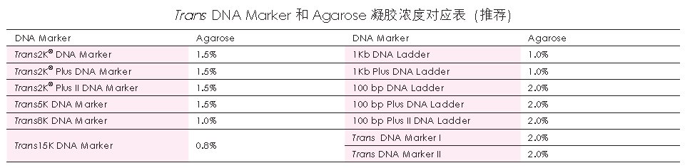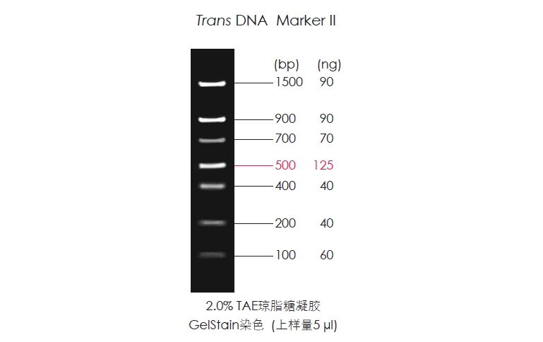 Trans DNA Maker II由7條線狀雙鏈DNA條帶組成,適用于瓊脂糖凝膠電泳中DNA條帶的分析,不建議用于聚丙烯酰胺凝膠電泳。本產(chǎn)品為即用型產(chǎn)品,已含有1×Loading Buffer,可根據(jù)實(shí)驗(yàn)需要,直接取5 μl電泳,使用方便,電泳圖像清晰。便于準(zhǔn)確判斷目的產(chǎn)物DNA的量。