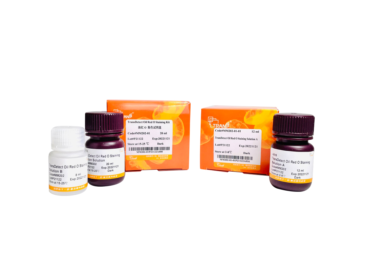 油紅O (Oil Red O) 屬于偶氮染料,是很強(qiáng)的脂溶劑和染脂劑,在脂質(zhì)內(nèi)能高度溶解,可特異性地與細(xì)胞或組織中的甘油三酯結(jié)合呈小脂滴狀。其原理是油紅O在脂類(lèi)中的溶解度比在溶劑中大,當(dāng)進(jìn)行細(xì)胞或組織染色時(shí),染料離開(kāi)有機(jī)溶劑而溶于細(xì)胞或組織內(nèi)的脂質(zhì) (如脂滴) 中,從而使細(xì)胞內(nèi)的脂滴呈橘紅色至紅色 (具體顏色因脂質(zhì)濃度而定) 。該產(chǎn)品適用于脂肪細(xì)胞的染色,也可配合TransDiffer? Human Mesenchymal Stromal Cell Adipogenic Differentiation Medium (TransGen, Cat.MM201) 進(jìn)行人間充質(zhì)干細(xì)胞成脂分化能力檢測(cè)。