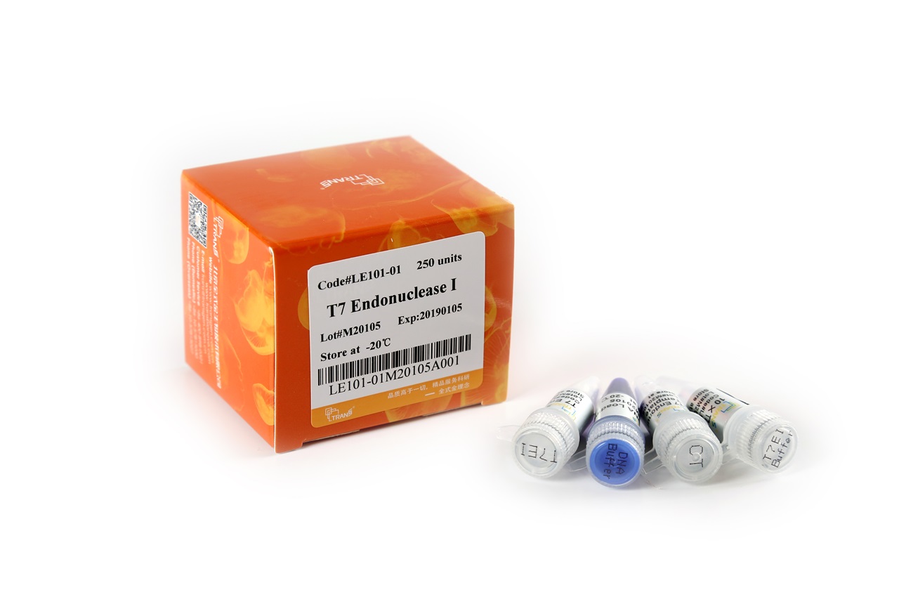 本產(chǎn)品由重組T7 Endonuclease I(T7EI)基因的載體,在大腸桿菌中經(jīng)誘導表達、純化而成。T7EI識別并切割不完全配對、含十字形結構、Holliday結構、異源雙鏈的DNA以及隨機切割單鏈DNA。該酶切割位點在錯配堿基5'端的第一、第二或第三個磷酸二酯鍵。