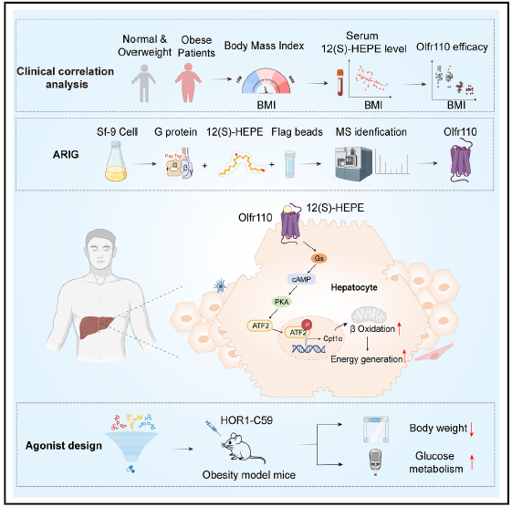 研究團隊發(fā)現(xiàn),源自魚油成分 ω-3 脂肪酸 EPA 經(jīng) 12-脂氧合酶代謝產(chǎn)生的氧化脂類分子 12 (S)-HEPE,其水平在肥胖小鼠及高體重指數(shù)(BMI)人群中顯著降低,并與有氧運動、魚油飲食帶來的代謝改善正相關(guān)。通過創(chuàng)新開發(fā)的“Anonymous receptor identification by reverse-G-protein pull down (ARIG) ”技術(shù),鑒定出嗅覺受體 Or5v1/Olfr110 是 12(S)-HEPE 的高親和力內(nèi)源性受體,發(fā)現(xiàn)肥胖人群中該受體活性降低的現(xiàn)象與 12(S)-HEPE 水平下降趨勢一致?;蚯贸∈竽P妥C實,全身敲除或肝臟特異性敲除 Or5v1/Olfr110 會導(dǎo)致代謝紊亂,而敲除小鼠中過表達該受體則可逆轉(zhuǎn)異常。信號傳導(dǎo)研究發(fā)現(xiàn) 12 (S)-HEPE 與 Or5v1/Olfr110 結(jié)合后,激活 Gs-PKA-pATF2 信號通路,上調(diào)肝臟中肉堿棕櫚酰轉(zhuǎn)移酶 1α(Cpt1α)的表達,進而促進脂肪酸氧化,減少脂質(zhì)堆積,最終改善胰島素抵抗,減輕體重。研究團隊基于 II 類嗅覺受體介導(dǎo)的脂肪酸氣味分子識別的機制研究(Cell,2026),通過計算機虛擬篩選和活性驗證,成功開發(fā)出高選擇性的人工小分子激動劑 HOR1-C59。在高脂飲食喂養(yǎng)的野生型小鼠中,給予 HOR1-C59 可顯著改善胰島素抵抗,減輕體重。
