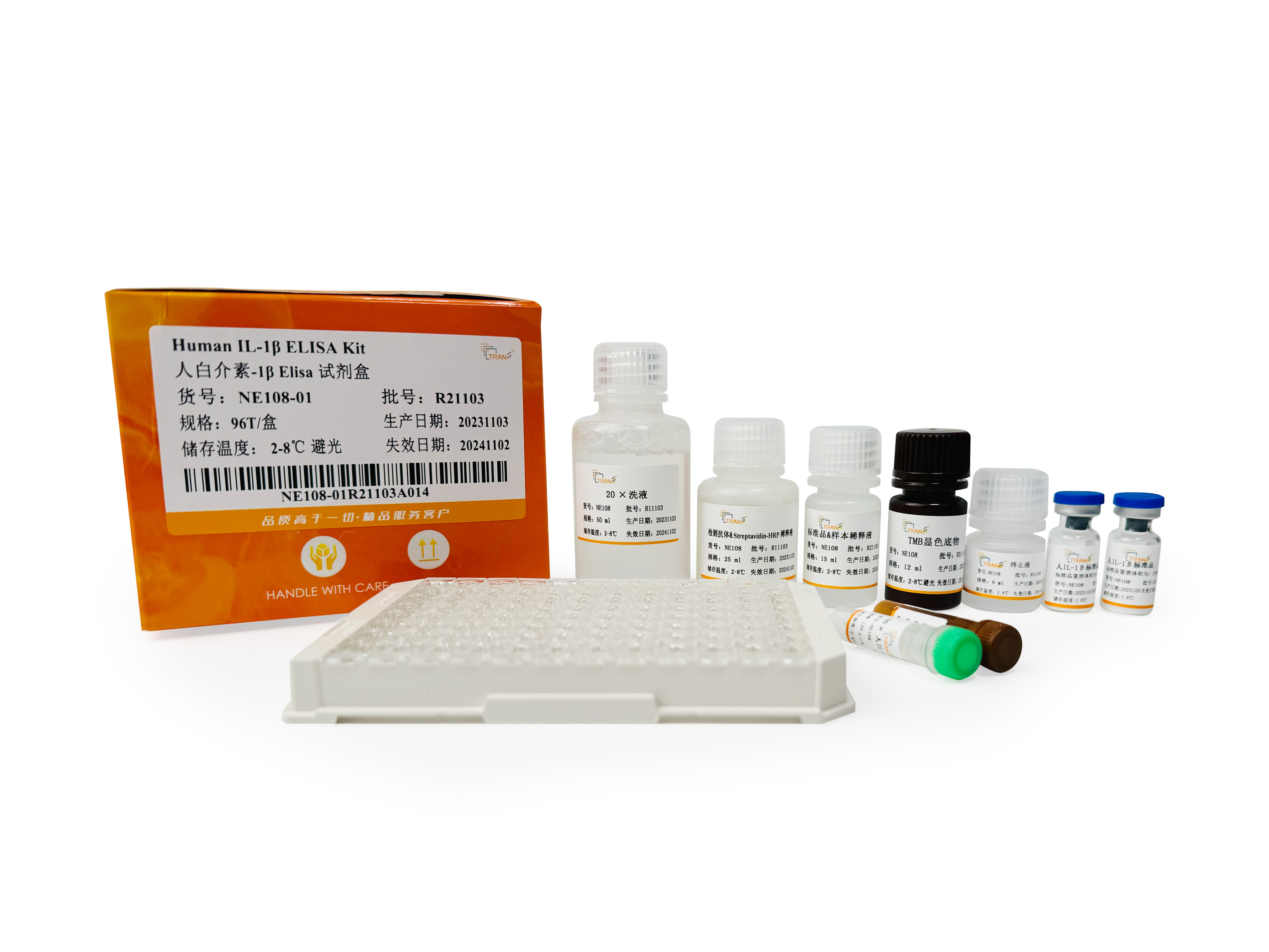 本試劑盒采用雙抗體夾心ELISA法定量測定人血清、血漿和細胞培養(yǎng)上清中的IL-1β含量。本試劑盒采用高親和力的抗人IL-1β抗體預包被酶標板,將標準品/待測樣本加入微板孔中,經過孵育后樣本中存在的IL-1β會與酶標板上的預包被抗體特異性結合。洗滌去除未結合物后,將生物素標記的抗人IL-1β檢測抗體加入微板孔中,再次孵育后檢測抗體會與錨定在酶標板上的IL-1β特異性結合。隨后,將辣根過氧化物酶標記的鏈霉親和素(Streptavidin-HRP)加至微孔板中并孵育,通過檢測抗體上的生物素和鏈霉親和素發(fā)生的高強度非共價結合,形成“包被抗體-人IL-1β蛋白-檢測抗體-Streptavidin-HRP”免疫復合物。再次洗滌后,將顯色底物TMB加至微板孔中,HRP會催化TMB底物生成藍色產物,顏色反應的深淺將與樣本中IL-1β的濃度成正相關。而后加入終止液終止反應,在450 nm波長(參考波長570 - 630 nm)處測定吸光度值。通過繪制標準曲線,由樣本吸光度值可計算出樣本中所含IL-1β濃度。本試劑盒特異性強、檢測靈敏度高,同時操作更加便捷。
