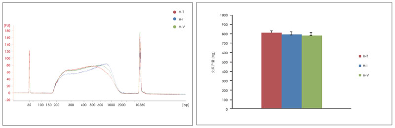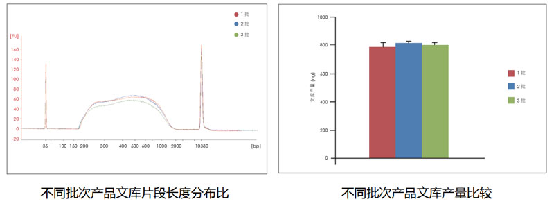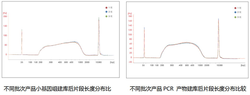 結(jié)果表明,不同批次產(chǎn)品片段長度分布一致,主要分布在200~2000 bp 之間,峰型的一致性與產(chǎn)量的一致性好,產(chǎn)品批次間的穩(wěn)定性非常好!