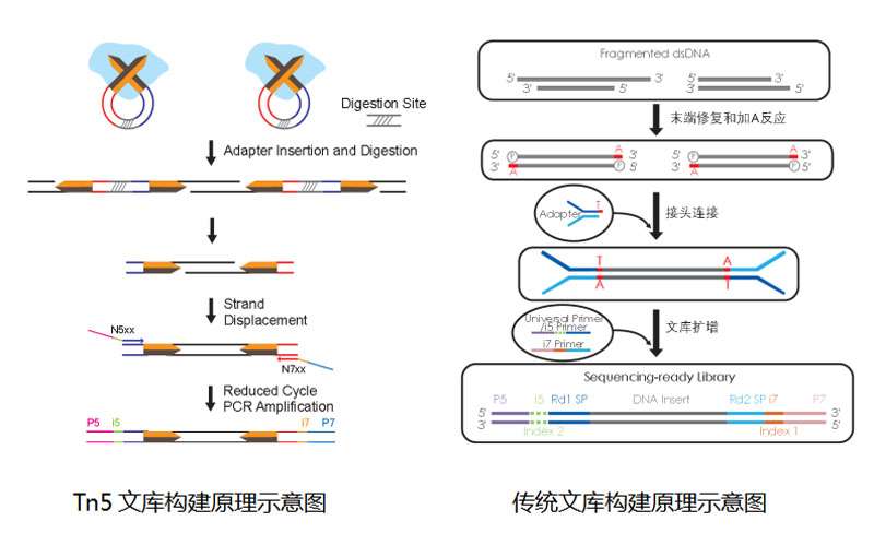 其文庫構(gòu)建原理與傳統(tǒng)文庫構(gòu)建的DNA片段化、末端修復(fù)加A、接頭連接、文庫擴增流程不同,Tn5 DNA二代測序文庫構(gòu)建是利用Tn5轉(zhuǎn)座酶將含有酶切位點的接頭序列隨機插入到DNA序列中,只需一步酶切即可完成片段化,接下來只需進(jìn)行文庫擴增,即可上機測序。