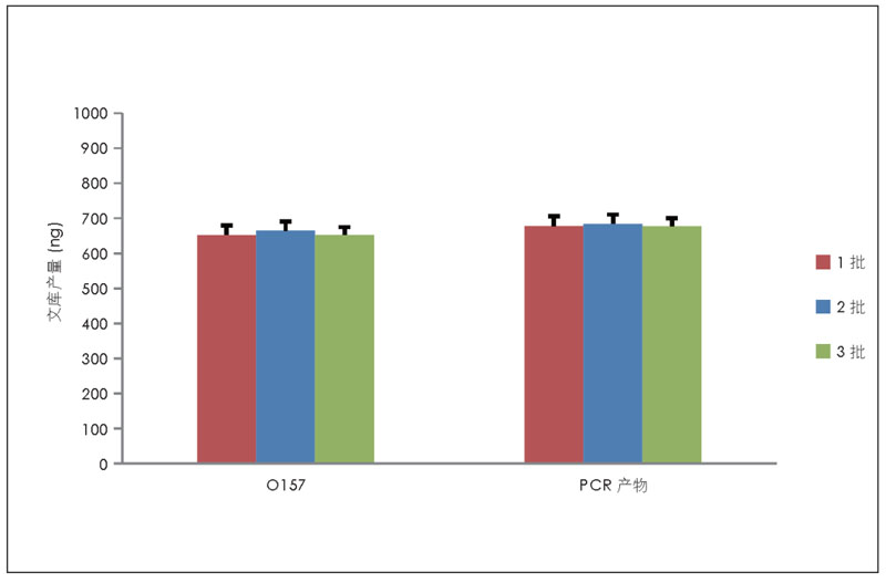以1 ng 大腸桿菌O157 基因組DNA 和PCR 混合產(chǎn)物 (4 kb、2 kb、1 kb 和500 bp PCR 產(chǎn)物等摩爾混合)為樣品,分別使用不同批次產(chǎn)品構(gòu)建全基因組短片段文庫,擴增12 個循環(huán),產(chǎn)物經(jīng)1.0×DNA 磁珠(TransGen, EC411) 純化( 不進(jìn)行文庫片段長度分選),文庫經(jīng)Agilent 高靈敏DNA 芯片鑒定,Qubit 檢測文庫濃度,計算文庫產(chǎn)量。
