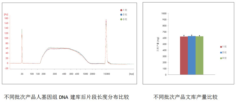 以50 ng 人基因組DNA 為樣品,分別使用不同批次產(chǎn)品構(gòu)建全基因組短片段文庫,擴增6 個循環(huán),產(chǎn)物經(jīng)1.0×DNA 磁珠(TransGen, EC411) 純化(不進(jìn)行文庫片段長度分選),文庫經(jīng)Agilent 高靈敏DNA 芯片鑒定,Qubit 檢測文庫濃度,計算文庫產(chǎn)量。