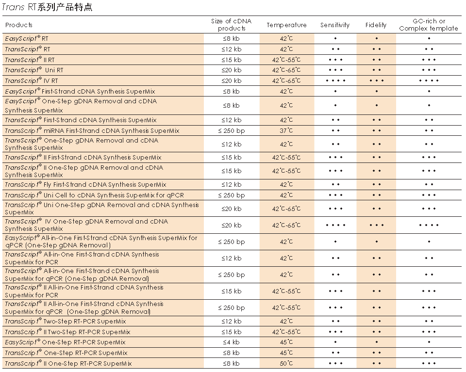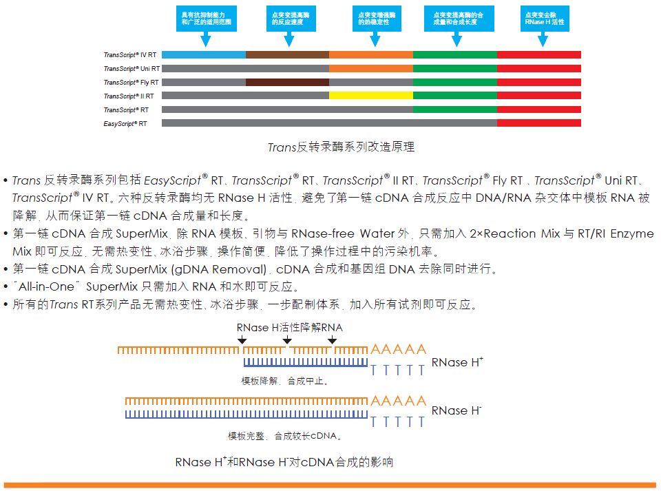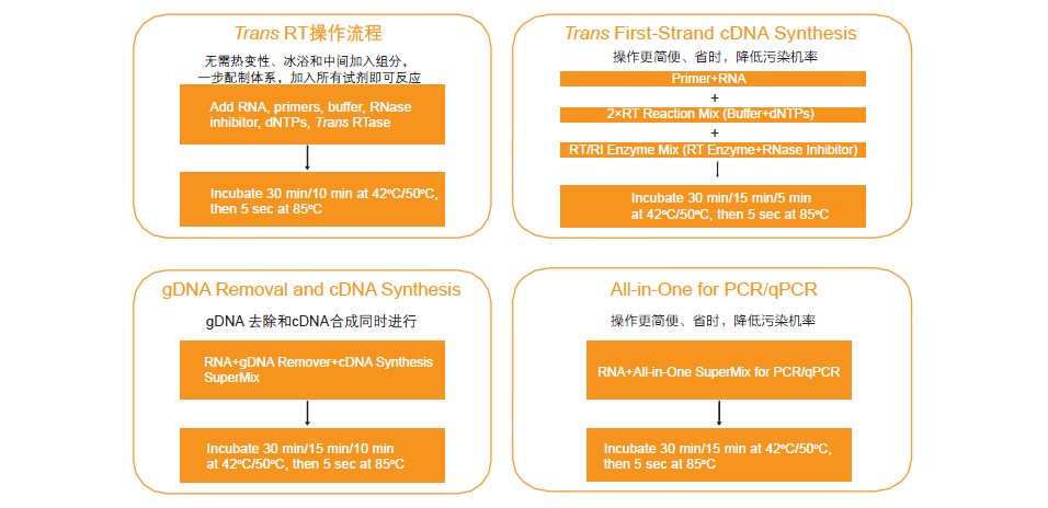 本產(chǎn)品含有反轉(zhuǎn)錄反應(yīng)所需的全部試劑(TransScript? RT, RNase Inhibitor, Anchored Oligo(dT)18 Primer, Random Primer(N9), dNTPs, Buffer),濃度為5×。反應(yīng)時,只需加入gDNA Remover、模板RNA和水即可高效地合成第一鏈cDNA,同時去除RNA模板中殘留的基因組DNA。另配有5×TransScript? All-in-One No-RT Control SuperMix for qPCR,用于配制無反轉(zhuǎn)錄酶的對照,判斷qPCR模板是否來自cDNA。該產(chǎn)品操作簡便,降低操作過程中的污染機率。cDNA只適用于qPCR,不適用于常規(guī)PCR。